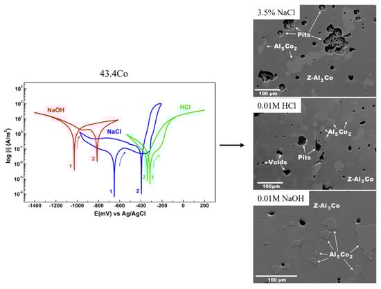 Potentiodynamic polarization curves for Al-43.4 wt % Co in 3.5% NaCl, 0.01M HCl, 0.01M NaOH and corroded surfaces under SEM after polarization (Reprinted with permission from [81], Copyright 2022, Springer Nature).