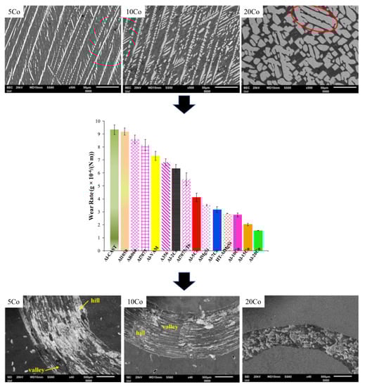 SEM images of Al-5 wt %Co, Al-10 wt %Co and Al-20 wt % Co (Red eclipse: side branching) as fabricated by vacuum arc melting and after sliding wear (ball on disk, 1000 m sliding distance, AISI 52100 steel counter body). Wear rates for Al-Co alloys (2-20 wt % Co) under sliding wear compared to various commercial Al alloys (Al1050, Al6060, Al7075, Al7075-T6, A356, AlMgSi) (Reprinted with permission from [35], Copyright 2022, Elsevier).