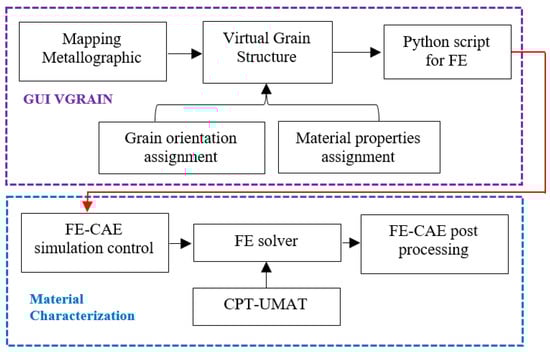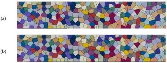 In order to simulate the mechanical behavior of a polycrystalline material at the grain level scale, a representative volume element (RVE) consisting of a sufficient number of grains is required in order to represent the global material behavior developed for (Figure 7). In this work, an RVE was developed to have a realistic microstructure of the material rather than the artificially constructed using Voronoi tessellation technique. Based on the material’s microstructure obtained from SEM, coordinates of grain boundaries were determined using VGARIN software. In order to get the actual dimensions of all the grains, SEM image was processed according to the actual scale to obtain the coordinates of all grain boundaries. The developed model herein is based on surface images of the material and thus considers the realistic microstructure only in 2D while neglecting the heterogeneity of the material in the third dimension.