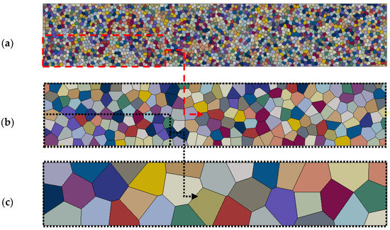 RVE for : (a) mm × mm with 6633 grains (RVE#1); (b) mm × mm with 199 grains (RVE#2); (c) mm × mm with 32 grains (RVE#3).