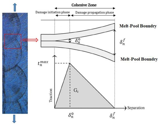 To investigate the damage and the interface interaction definition at the melt pool boundaries, CZM is used in this study. Cohesive traction-separation law is characterized by a relation between a cohesive traction vector and displacement separation vector acting across the cohesive surfaces. In other words, CZM is a continuous incident in which separation starts across an extended crack or cohesive zone that is limited by cohesive tractions. The crack path is defined by cohesive surfaces, by which herein they are considered at the pool boundaries. Based on existing literature and previous works by authors on the same material [17,34], porosity and anisotropy could emerge during the layer-by-layer printing process, which may result in imperfections or interlayer bonding weaknesses. In this work, we initially assume perfect grain boundaries. The melt pool boundaries are remarkably weaker than the grain boundaries and damage often initiates and propagates at these boundaries [35]. The cohesive response of the melt pool boundaries follows a traction–separation law (TSL). The traction between two crack surfaces is described as a function of the crack opening displacement and the relation is usually referred to as a TSL. Different TSLs with different shapes have been developed and proposed by authors. However, one of the most common TSLs is the triangular or bilinear shape as shown in Figure 9. The triangular CZM shape consists of two lines. The first line shows the initial stiffness which determines the region where the damage is zero within the studied boundary. The relation between the cohesive traction and separation can be expressed by Equation (7):