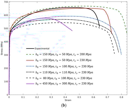 Sensitivity analyses need to be carried out to calibrate coefficients including the initial hardening modulus (), stage-I stress () and initial shear stress (). By using a single crystal material SS 316 L with FCC structure [39], a good agreement can be found between experimental and numerical curves obtained based on two sets of input parameters, as is illustrated in Figure 11a. By running several tests according to Figure 11b, and taking into the account that the RVE model containing 199 grains has a lower initial shear stress compared to the single crystal, the value of produced the closest match to the experimental stress strain graphs and can be used henceforth. The influence of the parameter on the calculated tensile curves determines the inclination and the curvature of the graph in the plastic region. Higher values of this parameter result in steeper curves; however, changing this value has little effect on the position of the maximum applied force and the value of is selected for this material behavior. Reference stress defines the onset of the large plastic deformation and its variation affects the length of the linear part of the curve beyond the yield point. Table 1 shows the calibrated hardening values based on the Bassani–Wu hardening rule using the present CP model.