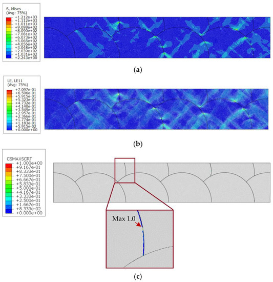 Defect formation in the area of the melting pool is a common problem in additive manufacturing technology. Melting pool boundaries between successive tracks may induce crack initiation when tensile loading increases to a certain level [41]; damage evolution in the melt pools is considered herein. In Figure 14a,b, the distribution of stress and strain in the beginning of material response degradation is shown. The node with maximum stress-strain represents the peak values of the traction that correspond to the when the deformation is almost normal to the melt pool interface. The process of degradation (damage evolution) begins once the traction or separation law meets a certain damage initiation criterion. The quadratic nominal stress criterion is assumed in this study, in which damage initiates when a quadratic interaction function reaches a value of one (Figure 14c).