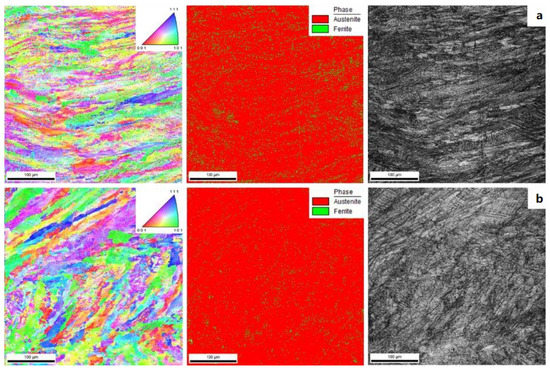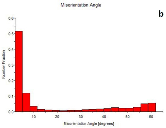 For brevity, electron backscatter diffraction (EBSD) maps are discussed here to validate the results of the CP finite element model. For this purpose, a scanning electron microscope (FEI Quanta 400 FEG ESEM) equipped with a unit (TSL-EDAX EBSD) was used for phase identification and grain size detection. For EBSD evaluation, the samples went through an additional polishing step, using a silica colloidal suspension, for a superior surface finish and removal of polishing induced plastic deformation, allowing us to obtain Kikuchi patterns [41]. EBSD maps of microstructures, phases and crystallographic directions of the SS 316L tensile test samples ( and ) are shown in Figure 15, allowing the observation of a single-phase -austenite structure. Consequently, as for the specimen map (Figure 15a), the austenite content is 93.10% and the ferrite content (martensite) is 6.9%, while for the specimen (Figure 15b), these percentages are and respectively. These differences in induced phases stem from various heating and cooling cycles during printing of the cube. By increasing the deformation, martensite formation occurs in austenitic stainless steel, which is formed by stacking the grain contours’ dislocations, when high stress is reached, promoting a barrier to sliding. Twin boundaries in stainless steel can be formed during annealing in steel production and subsequent plastic deformation. The higher density of dislocations also facilitates twin boundaries, since twins’ nucleation requires high stresses, which normally develop in dislocation clusters. The maps show sliding bands that can be seen in Figure 16, which are regions of high dislocation density. The decrease in grain size also indicated the more pronounced refinement of the microstructure during stress. The higher the dislocation density, the more pronounced the microstructure’s refinement effect during stress, producing a greater amount of grain boundaries that can act like a smaller grain effect. The specimen (Figure 16a) showed a more refined structure than the specimen (Figure 16b), where the influence of the application of stress was more evident, producing grains from high angles of misorientation, as shown in Figure 17a,b. Increasing misorientation is associated with the reduction of dislocations and promotes the nucleation of twin deformation. This phenomenon acts as a barrier to dislocations and increases the mechanical resistance of the material, which may act like decreasing grain size.