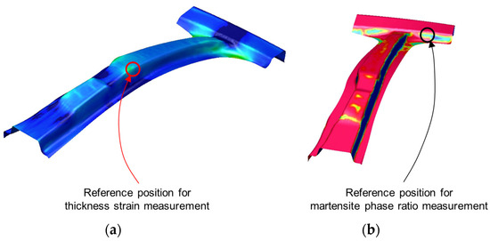 The position and minimum value of the martensite phase ratio at 30 s after stamping and die quenching for (a) part from sheet blank thickness of 1.8 mm and (b) part from sheet blank thickness of 2.1 mm.