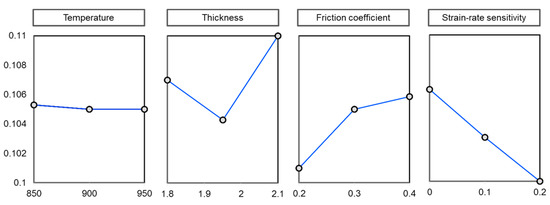 Effects of temperature, thickness, friction coefficient, and strain-rate sensitivity on thickness strain (main effects plot from Minitab).
