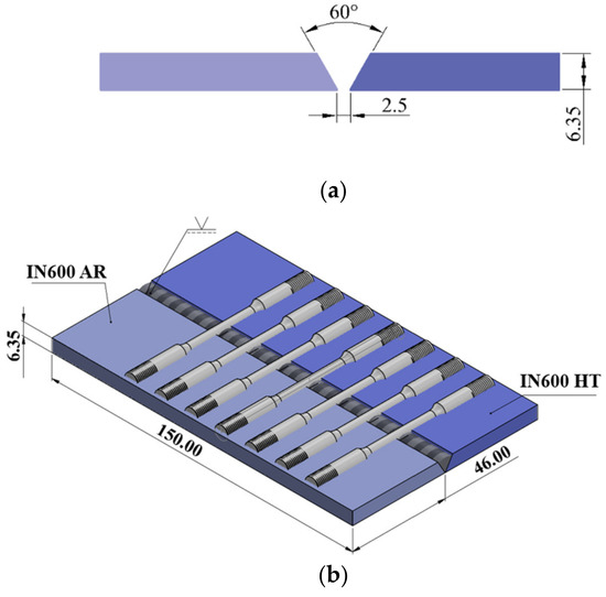 In the current study, 6.35 mm thick plates of IN600 with the chemical composition shown in Table 1 were used. The chemical composition was checked by optical emission spectroscopy (OES) and the analysis drew very low contents of elements such as Mo, Nb, N, W, V, Mg, and Co with a total weight of 0.27%. In order to simulate thermal aging in IN600 during service, pieces of the alloy in the as-received (AR) condition from the supplier were heat-treated (HT) at 700 °C in a muffle furnace for 300 h and quenching in water. AR plates were gas metal arc welded (GMAW) to HT plates using a Miller Dimension 652 power source machine. Prior to welding, the plates were machined for a single V-groove butt joint, as schematically shown in Figure 1a. Maintaining an appropriate distance between plates will help to achieve the full penetration particularly with the low fluidity Ni-based filler; for this reason, a root gap of 2.5 mm was chosen. ER310 and ERNiCrMo-3 filler wires of 1.2 mm in diameter were employed and their chemical compositions are also listed in Table 1. Gas mixtures of 97%Ar + 3%N2 and 95%Ar + 3%N2 + 2%O2 were supplied at 18 L/min to shield the weld pool while welding with the ER310 and ERNiCrMo-3 electrodes, respectively. The filler wires were fed at 120 mm/s. A constant potential power source was employed and to succeed in the fusion welding of the butt joints, 1.286 and 1.75 kJ/mm were input for the ER310 and ERNiCrMo-3 electrodes, respectively.