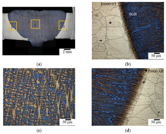 (a) Macrograph of the welded joint obtained with the ERNiCrMo-3 filler and (b–d) microstructural details as observed in the OM.