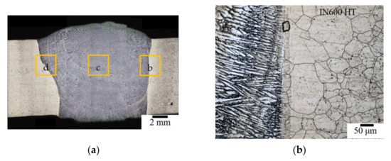 Microstructural characterization of the IN600 base materials and welded joint was performed by optical (Zeiss Axio Observer 7 Materials, Carl Zeiss Microscopy, Oberkochen, Germany) and electronic (field emission gun scanning electron microscope, Jeol 7600F, Jeol Ltd., Tokyo, Japan, equipped with energy dispersive X-ray detector, XFlash Detector 6|10, Bruker AXS GmbH, Berlin, Germany) microscopy. The samples were ground using standard metallographic techniques and electropolished with 10–20% perchloric acid in ethanol at 13 V for 20–30 s. Subsequently, the samples were electro etched in 10% sulfuric acid at 3 V for 8 s.