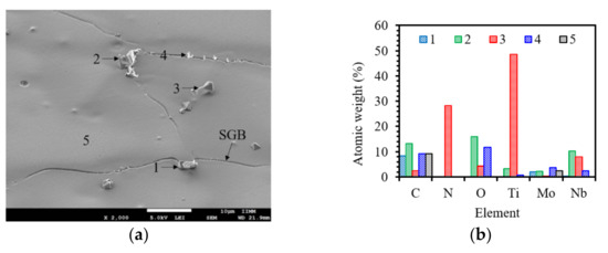 Figure 5a shows the SEM image captured in secondary electron mode of the weld obtained with the ERNiCrMo-3 filler. As expected, the weld metal was crowded with a variety of secondary phases. The particles exhibited complex shapes and were randomly distributed within the grains and in the grain limits. Figure 5b presents the chemical compositions obtained with the EDX punctual analysis of the microstructural features indicated in the micrograph. According to these data, the secondary phases were composed of Nb, Ti, and Mo, with traces of C and O. Similar results were found by Cipriano-Farias et al. [38]. Silva et al. [34] found the formation of Laves phase around some nitrides and carbonitrides of Nb; the Laves phases grew from those particles toward the matrix. The formation of secondary phases in the WM of this joint was caused by the rejection of Nb and Mo when the Ni matrix was rapidly saturated in these elements during solidification. The Laves phase formation in the WM was estimated to be 2.2%, according to Dupont’s et al. [39] formula, by using the distribution coefficient, k, equal to 0.55 for Nb, as calculated from the EDX punctual microanalysis in the weld metal. It has been documented that the formation of a Nb-rich phase such as Laves may cause cracking during solidification due to the melting point of this phase [40], but in the current study, this defect was not observed.