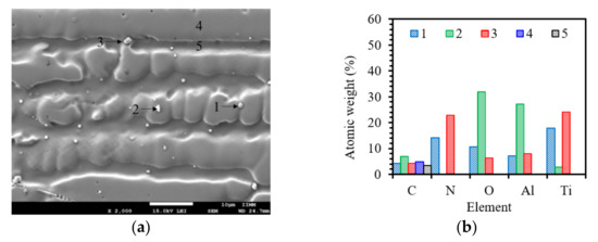 Regarding the weld with the ER310 filler, few and tiny secondary phases were seen in the weld metal, as revealed by the micrograph shown in Figure 6. The EDX punctual analysis of the spots labelled in Figure 6a indicate that these particles were mainly composed of Ti, Al, and O (see Figure 6b), suggesting that they are oxides and complex phases such as oxi-nitrides. The amount of secondary phases present in the WM will depend on the amount of alloying elements that compose the material and their tendency to form a solid solution with the matrix (k > 1) or to segregate (k < 1). For example, Cr has been reported to be an element that can be segregated in the WM [41], in this work, this was not the case. A feature that was noted and reported in a previous study [42] was that some austenitic dendrites showed slip bands generated during the welding due the high quantity of the tensional residual stress through the effect of the solidification process.