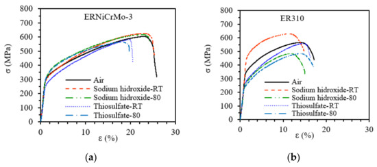The stress–strain curves of the IN600 welds immersed in 0.1 M Na2S2O3 and 5M NaOH at Ecorr as tested at room temperature and 80 °C for (a) ERNiCrMo3 and (b) ER310 fillers.