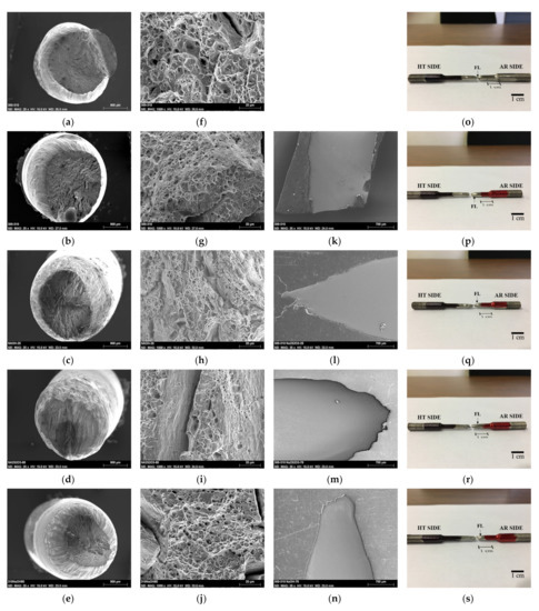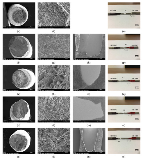 The SEM characterization of the fractured specimens for the ER310 welded joint in the inert and corrosive environments. (a,f,o) air; (b,g,k,p) Na2S2O3 at RT; (c,h,l,q) NaOH at 25 °C; (d,i,m,r) Na2S2O3 at 80 °C, and (e,j,n,s) NaOH at 80 °C.