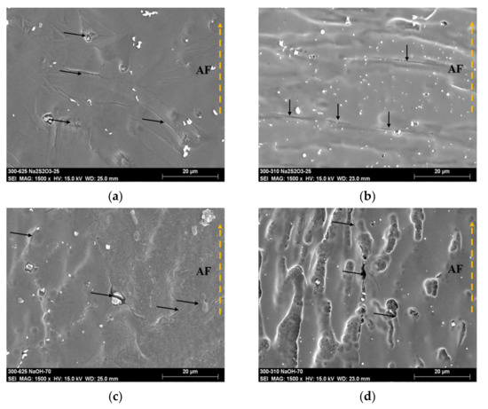 The secondary cracking of IN600 welds after SSRTs in (a,b) Na2S2O3 at RT and (c,d) NaOH at 80 °C. AF = applied force direction, (a,c) corresponds to the ERNiCrMo-3 weld and (b,d) to the ER310 weld. Black arrows point to the secondary cracks.