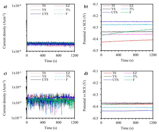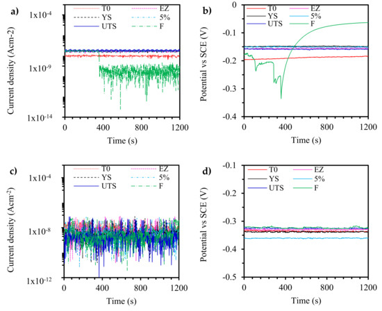 Figure 11 and Figure 12 display the fluctuation of the current density and potential during the SSRT in the two electrolytes used to promote the corrosion process. In Figure 11a–c a–c and Figure 12a–c, observations of the current fluctuation signal showed that the current density rapidly increased to an anodic value in the elastic zone, but when the σy was overcome, the anodic current only exhibited a lower change. In the failure time, the anodic currents observed in the previous stage newly changed to a cathodic value (i.e., the current density decreased), and at the same time, the potential changed to less noble when the failure was completed (see Figure 11b,d and Figure 12b,d). On the other hand, for the potential changes observed in Figure 11b,d and Figure 12b,d, Zhiming et al. [52] described that the potential transients were associated with the sudden rupture of the passive film on the strained sample, and then the sample gradually re-passivated in the film fracture zone. In Figure 11c, higher fluctuations could be observed in the Na2S2O3 solution at 80 °C during the SSRT, so these fluctuations, referred to as over position events, were the anodic and cathodic currents that suddenly changed almost at the same time [30]. This was due to the high energy from the strain and corrosion processes when the temperature increased. Another characteristic where the noise behaved with greater fluctuations, as can be seen in Figure 12, was because the materials failed, showing a brittle characteristic, as was the case for the ER310 welded joint (see Figure 8 and Figure 9).