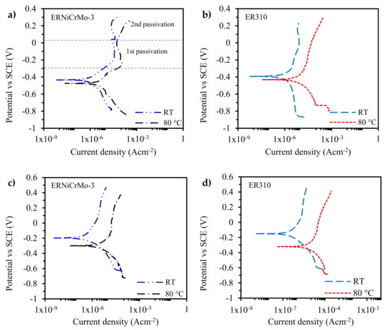 Two different media were used to perform the corrosion stress cracking (CSC) tests; for this purpose, potentiodynamic polarization tests were performed on the NaOH and Na2S2O3 electrolytes at room temperature and at 80 °C on the ERNiCrMo-3 and ER310 welds. Figure 13 displays the polarization curves of the two weldments in Na2S2O3 and NaOH. The ERNiCrMo-3 weld showed an active region up to potentials of −0.15 V vs. SCE in the 5 M NaOH electrolyte, and after this potential, a passive region (Figure 13a) was seen up to E = 0 V vs. SCE and then a trans-passive region was formed. The welds showed passivity in the sodium thiosulfate and sodium hydroxide solutions and pitting corrosion was not present during the anodic scanning. When the temperature of the electrolyte was 80 °C, both the anodic and the cathodic reactions presented higher current densities than those at RT, and the corrosion potential was displaced to more active values. The effect was more severe in the welds made with the ER310 than with the ERNiCrMo-3 filler metal. However, the anodic and cathodic kinetics maintained the same tendency (slope) at RT and at 80 °C for both the filler metals and the electrolytes tested. The anodic polarization did not induce localized corrosion. The results are in good agreement with the observations in the SSRT results (Table 2). According to the results of the EN, the corrosion potential during the SSRT was anodic, which indicates that the passive film formed in the surface of the welds was stable, maintaining the passive state that was seen in the polarization scanning. Thus, it might be concluded that if the passive film breaks, it will be rapidly regenerated. Meanwhile, the current density oscillations could be due to the breaking and regeneration of the passive film, which entered the trans passive dissolution zone (as seen in Figure 13a). In the NaOH solution, the trans passivity was caused by the breaking of the film in the mode of metal vacancy [53]. The increase in the output current in NaOH for the ERNiCrMo-3 weld was less pronounced than in the ER310 weld, and this difference was almost at 1 order of magnitude. It was observed that the results of the traces shown in Figure 13a,b were consistent with the results obtained in the SSR tests. In Figure 13c,d, it was observed that the susceptibility in the ER310 weld was lower than in the ERNiCrMo-3 weld. It has been reported in the literature that stainless steel shows a susceptibility to SCC when it is in contact with NaOH [50], and conversely, the Ni-based alloys showed a susceptibility to SCC in sulfide environments [54].