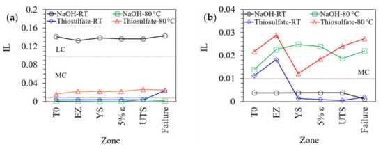 Figure 14 shows the localization index (LI) obtained in thiosulfate and caustic sodium for the two weldments. As can be seen in Figure 14a, during the SSR tests, the LI was very close to zero, but a change in the corrosion behavior was evident. For example, the LI in Na2S2O3 increased, and the corrosion behavior changed from uniform corrosion to mixed corrosion. In the counterpart, the LI in caustic sodium at 80 °C showed localized corrosion, since LI is directly dependent on the current density. According to the results of the polarization curves (Figure 13), the corrosion rate increased with the increment in temperature. This effect is related to the reduction observed for the index mechanical properties of the SSRT results (Table 2). This may be explained by the formation of metastable pits (passive with the time) during SSRT. The sample showed a similar behavior of LI during the SSRT when it was immersed in NaOH and Na2S2O3, as can be seen in Figure 14a. Conversely, in Figure 14b, with an increase in the solution temperature, the corrosion mode observed in the LI results shifted from localized corrosion to mixed corrosion. A remarkable observation in Figure 14 was that when the samples were in the plastic zone, they suffered a change in the LI value, but in this plastic zone, the LI behaved linearly or the slope was ~0. Another finding was that when a material showed higher susceptibility (see Iδ in Table 2) in a media, the LI tended to have a value of zero or the corrosion type was uniform corrosion.