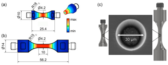 Specimen shapes used in ultrasonic axial and torsion fatigue tests at different R-ratios can be seen in Figure 1a. The stress distribution along the specimens’ length axes as a result of resonance vibrations is shown as well as the stress gradient across the cross-section resulting from torsion loading. The volume subjected to more than 95% of the nominal stress is 174 mm3 and 1.79 mm3 under axial and torsion loading, respectively.