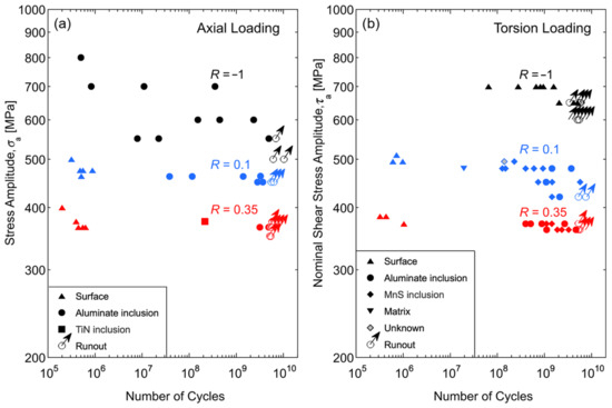 Fatigue data for cyclic axial loading (a) and cyclic torsion loading (b) at a load ratio of R = −1 (black symbols), R = 0.1 (blue symbols) and R = 0.35 (red symbols); surface crack initiation and internal crack initiation at aluminate, TiN or MnS inclusions or in the metal matrix are distinguished using different symbols; circles with arrows mark runout specimens.