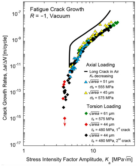 Crack propagation rates are plotted vs. stress intensity factor amplitudes, Ka. Data obtained under axial (triangles) and torsion (diamonds) loading fall within the same band of scattering, and no influence of loading condition is visible. The most striking result is that very slow growth rates in the regime between 10−14 m/cycle to 10−13 m/cycle corresponding to values of Ka between 3.8 MPa and 4.0 MPa could be experimentally verified. Such slow growth rates correspond to several thousand load cycles that are, by mean, necessary to propagate the crack by one atomic distance. The fracture surface morphology produced by crack growth in vacuum at growth rates below 10−12 m/cycle is a so-called optical dark area (ODA) [54] or fine granular area (FGA) [55] and appears similar to those found around interior inclusions as shown in Figure 3. It was demonstrated that the formation of this area consumed 98% of the VHCF lifetime of the torsion specimen [8]. For comparison, the solid line shows crack growth data measured in ambient air at 30 Hz [37].