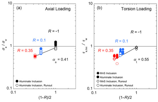 Evaluation of the exponents αa and αt that consider the R-ratio dependency of internal inclusion-initiated fracture under axial loading (a) and torsion loading (b); failures (closed symbols) and runouts (open symbols) are shown vs. the ratio of stress amplitudes, σa and (a) and the ratio of shear stress amplitudes at crack initiation, τa,loc and (b); data points for aluminate and MnS inclusion-initiated fracture under cyclic torsion at R = 0.1 and 0.35 have been intentionally set apart for better visibility.