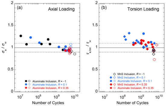 For the sake of conservatism, all displayed data points in Figure 6 representing failures should be larger than 1. Five data points for axial loading and one for torsion loading fall below this line; however, all these data represent failures above 109 cycles. Equations (9) and (10) therefore well predict the fatigue limit for limiting lifetimes of 109 cycles and only slightly overestimate the fatigue limit at 5 × 109 cycles. Again, the prediction lies within the prediction error of 10%.
