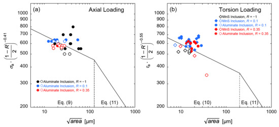 Furthermore, runouts and failures—independent of inclusion type—serve to evaluate the exponents αa and αt that consider the R-ratio influence on the fatigue limit. Data for fitting in Figure 5 were chosen as explained in the following: If failure occurred (i.e., at all R-ratios under axial and at R = 0.1 and 0.35 under torsion loading, respectively), the one maximum value of and obtained by a runout was used that was below the lowest respective value obtained by a failed specimen. If no failure occurred, which is the case at R = −1 under torsion loading, the maximum value of of a runout was chosen. Through these data points, straight lines were drawn, and the slopes corresponding to the exponents αa and αt were determined. The exponent for axial loading αa was found to be 0.41, and the exponent for torsion loading αt was 0.55. Values for the exponent α measured for different steels are available in the literature, however, solely for axial and not for torsion loading. The reported exponents are in the range between 0.368 and 0.546 [17,20,28,54]. Hence, the presently determined value fits well with the literature data.