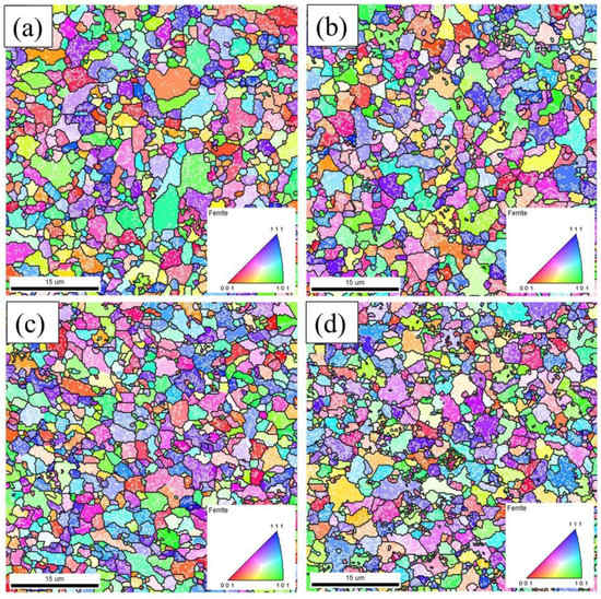 EBSD mapping of grain orientations and grain boundaries of FeCrAl ODS steels with different Zr contents: (a) 0 wt.%, (b) 0.3 wt.%, (c) MEDIA CYBERNETICS 0.6 wt.%, (d) 1.2 wt.%.