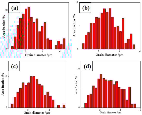 In order to analyze the effects of Zr content on the grain size distribution of FeCrAl ODS steels, Image-Pro Plus (6.0, MEDIA CYBERNETICS Inc., Rockville, MD, USA) was used for analyzing the grain sizes according to Figure 1. Figure 2 shows the grain size distribution of FeCrAl ODS steels with different Zr contents in terms of area percentage of grains in different size ranges. As observed, the grain size distribution of FeCrAl ODS steel without Zr addition is relatively discrete and shows the characteristic of bimodal distribution, in which the diameters of small-sized grains are concentrated within the range of 2–4 μm, and those of relatively large grains are approximately 6 μm. After the addition of the Zr element, the grain size distribution range of FeCrAl ODS steels is narrowed (mainly within 2–4 μm), and the number of large-sized grains is significantly reduced.