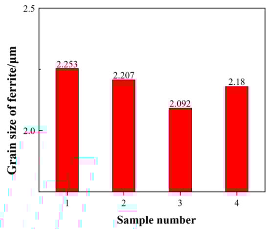 Figure 3 shows the calculated average grain sizes in the as-prepared samples based on Figure 1. As observed, the grain sizes of FeCrAl ODS steel samples with Zr addition are all smaller than that of the sample without Zr addition, suggesting that the addition of the Zr element can refine the grains. With the increase of Zr content, the grain size decreases first and then increases. When the Zr content is 0.6 wt.% (Sample #3), the grain size is the smallest. When the Zr content increases from 0.6 to 1.2 wt.%, the grain size increases, but it is still slightly smaller than that of samples with 0.3 wt.% Zr element. The change trend of the calculated average grain size is consistent with that of the grain size distribution in Figure 2. To be specific, when the Zr content is 0.6 wt.%, the grain size distribution is the most concentrated, and the proportion of grains over 4 μm is the lowest. Hence, the average grain size of samples with 0.6 wt.% Zr element is the smallest.