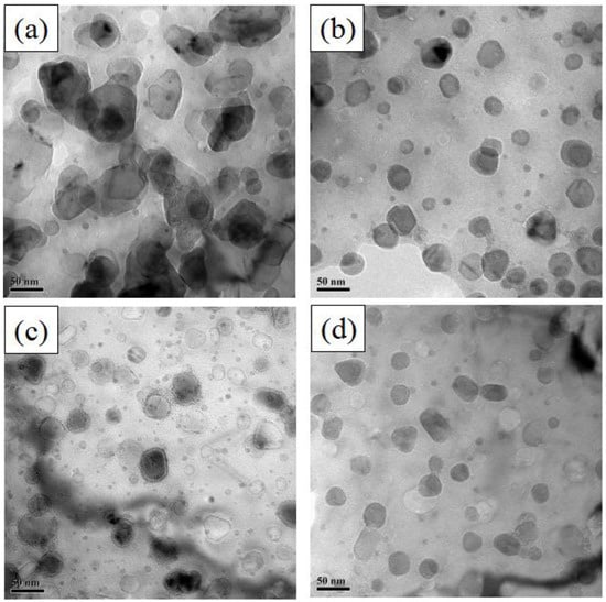 Dispersed nano-sized second phases in the matrix of FeCrAl ODS steels with different Zr contents: (a) 0 wt.%, (b) 0.3 wt.%, (c) 0.6 wt.%, (d) 1.2 wt.%.