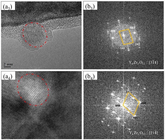 High-resolution TEM images and corresponding diffraction spots of dispersed nanoscale phases in the matrix of FeCrAl ODS steels with different Zr contents (Zr content = (a1,b1) 0 wt.%; (a2,b2) 0.3 wt.%; (a3,b3) 0.6 wt.%; (a4,b4) 1.2 wt.%). (The red circles indicate the boundary of nano-sized particles, and the orange lines indicates the zone axis).