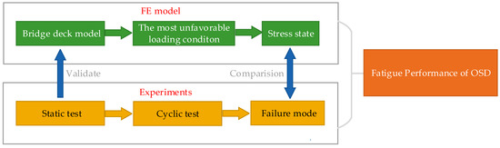 Although scholars have completed a lot of studies on the fatigue properties of metal materials and orthotropic steel bridge decks, due to the differences in materials, designs, and construction details, it is still necessary to conduct numerical and experimental studies on the fatigue performance of specific long-span steel bridge decks in order to ensure safety during their service. Therefore, this study is based on the Mingzhu Bay steel truss arched bridge. A finite element model of a bridge deck was first established to investigate the stress state and the most unfavorable loading position. Four single U-rib specimens were used to investigate the crack initiation, propagation process, and fatigue failure modes. Finally, the fatigue performance of the steel deck was evaluated according to the specifications. Figure 1 shows the flow chart of this paper.