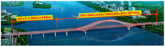 The Mingzhu Bay Bridge main bridge adopts (96 + 164 + 436 + 164 + 96 + 60) m = 1016 m span continuous steel truss bridge [38]. The main span of the main bridge is three arched truss structures; the truss spacing is 18.1 m, the side truss height is 10.369 m, the middle truss height is 10.685 m, and the side span and the second side span are flat truss structures. The side span and the main arch rib are “N”-type trusses. The layout of the Mingzhu Bay Bridge is shown in Figure 2.