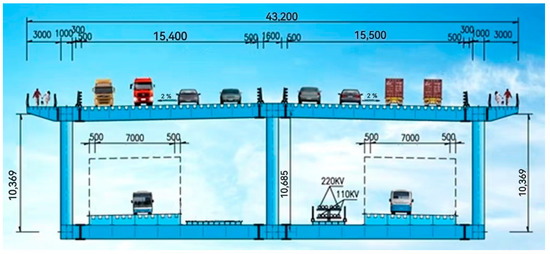 The steel deck of the Mingzhu bay Bridge adopts a double-deck arrangement, as illustrated in Figure 3. The upper deck is a two-way, eight-lane highway with sidewalks on both sides. The total width of the main bridge deck is 43.2 m. An orthotropic steel deck with a thickness of 16 mm and a u-shaped closed rib with a spacing of 600 mm are adopted. A diaphragm is provided every 3 m longitudinally and bolted with the upper chord.