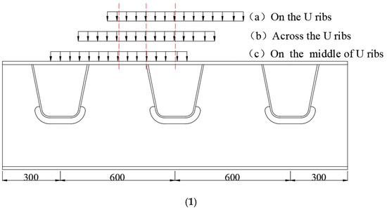To investigate the stress state and the most unfavorable wheel loading position, three loading conditions were considered, and the stress state of the bridge deck was analyzed. The details were as follows: (1) from the transverse direction, three wheel-loading positions were across the U-ribs, on the U-ribs, and between the U-ribs; (2) from the longitudinal direction, two loading positions were on middle span and OSD diaphragm. The details are shown in Figure 4.