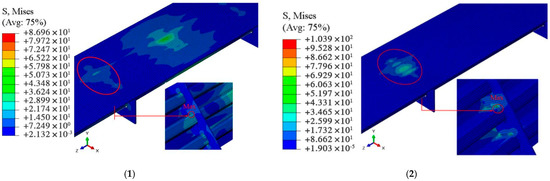 Stress state of the bridge deck (unit: MPa). (1) Mid-span loading; (2) diaphragm loading.