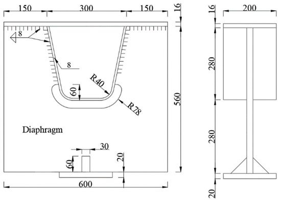 Based on the FE analysis, a single U-rib was selected for the fatigue specimen, and the loading was on the U-rib. The fatigue specimen design was fabricated according to the design of the Mingzhu Bay bridge; the height and length were 560 mm and 600 mm, respectively. The thickness of the bridge deck was 16 mm; the welded seam was 8 mm in width. An extra steel pad and stiffener were welded to the bottom to maintain the stability of the loading. The steel grade was Q370qD, and the welding wire and process were the same as the Mingzhu Bay Bridge. The dimension details are shown in Figure 6.