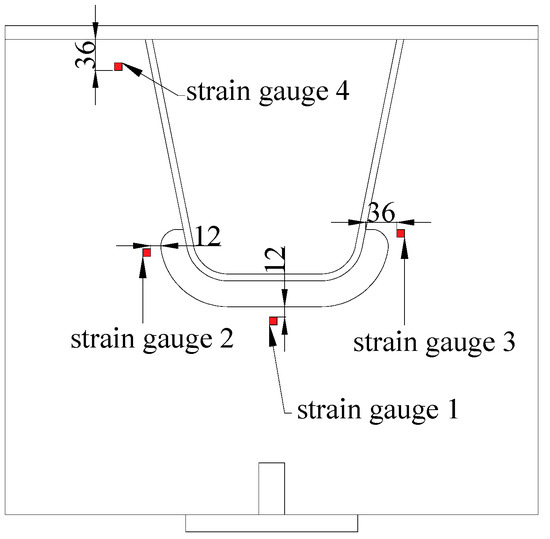 The objective of static loading was to validate the FE model, which was a three-span, three-U-rib OSD structure. Since the fatigue wheel load was in the elastic range, the static loading and unloading procedure involved 50 kN increments to 350 kN and decreases to 50 kN. The strain gauges were distributed at the concerning points. The strain gauge arrangement is shown in Figure 7.