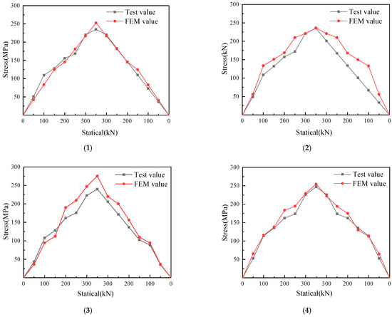 Stress comparison between test and FE model. (1) Strain gauge 1; (2) strain gauge 2; (3) strain gauge 3; (4) strain gauge 4.