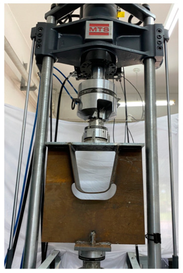 An MTS hydraulic fatigue test machine (Mechanical Testing & Simulation, Eden, MN, USA) was used for the fatigue test loading, as shown in Figure 9. The cyclic load was 120 kN with an amplitude of 80 kN and 100 kN, and the cyclic frequency was 5 Hz.