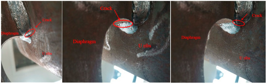 As seen in the experiment’s phenomena, fatigue cracks also occurred at the welding seam between the U-rib and diaphragm, which were around the arc cut-out area of OSD. The fatigue cycles of all specimens were over two million in number and met the specification requirement.