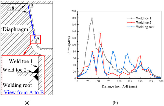 Area of concern and welded seam stress. (a) Schematic diagram of welded seams; (b) seam stress.