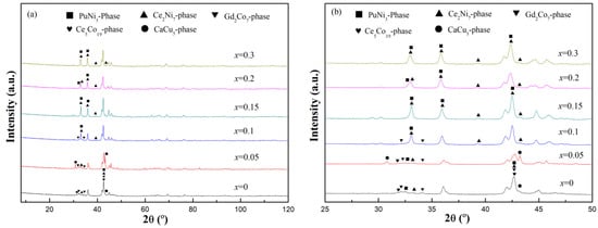 The superlattice structure alloys are formed by stacking the [A2B4] subunit (Laves-type structure) and [AB5] (CaCu5-type structure) subunit along the c-axis [16]. La2Ni7 alloy is prone to hydrogen-induced amorphization, hydrogen-induced phase transformation and disproportionation during the hydrogen absorption/desorption process [17,18,19]. This is mainly due to the large volume mismatch between the [La2Ni4] and [LaNi5] subunits, and hydrogen only enters into the [La2Ni4] subunit and not into the [LaNi5] subunit, which causes the “anisotropic expansion” of the alloy during hydrogenation. After adding Mg to La2Ni7 alloy, since the atomic radius of Mg (RMg = 1.72 Å) is smaller than that of La (RLa = 2.74 Å), and Mg only occupies the La sites in the [A2B4] subunit, with the addition of Mg, the volume mismatch between the [A2B4] and [AB5] subunits reduces, which effectively improves the hydrogen absorption/desorption properties of the alloys [20,21]. Unlike La2Ni7, Latroche et al. [22] found that the hydrogen storage capacity of Y2Ni7 alloy did not decay after several hydrogen absorption/desorption cycles at 0.1 and 0.7 MPa, and the alloy structure remained unchanged, but there were three hydrogen absorption/desorption plateaus at 10 MPa and the plateau pressures were higher (0.055 MPa, 0.5 MPa, 2.9 MPa); therefore, Y2Ni7 alloy was not properly used as an alloy electrode material. Paul-Boncour et al. [23] studied the La2−xYxNi7 (x = 0–2) alloy and found that Y preferentially occupies La sites in the [A2B4] subunit and the atomic radius of Y (RY = 2.27 Å) is smaller than that of La (RLa = 2.74 Å); the addition of Y in La–Y–Ni alloys helps to adjust the volume mismatch between the [A2B4] and [AB5] subunits. Therefore, the effect of Y in La–Y–Ni alloys is similar to the Mg in La–Mg–Ni alloys. In addition, Yuan et al. [14] studied the La3−xYxNi9.7Mn0.5Al0.3 (x = 1, 1.5, 1.75, 2, 2.25, 2.5) alloys and found that the alloy electrodes had better overall electrochemical performance when x = 1.75–2.25.