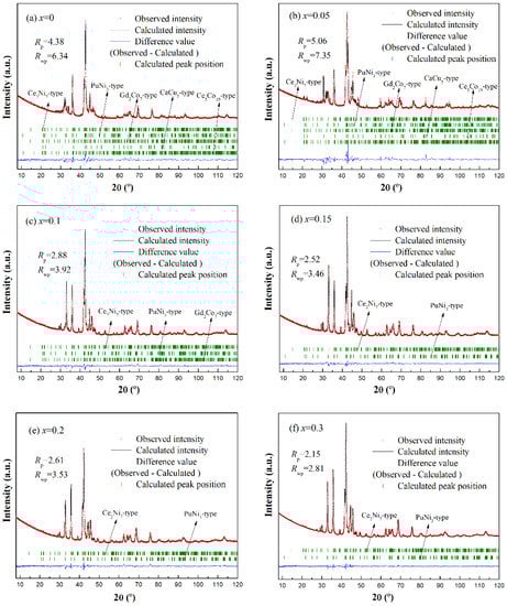 Rietveld refinement pattern of the XRD data for Y0.75La0.25Ni3.5−xMnx (x = 0, 0.05, 0.1, 0.15, 0.2, 0.3) alloys: (a) x = 0; (b) x = 0.05; (c) x = 0.1; (d) x = 0.15; (e) x = 0.2; (f) x = 0.3.