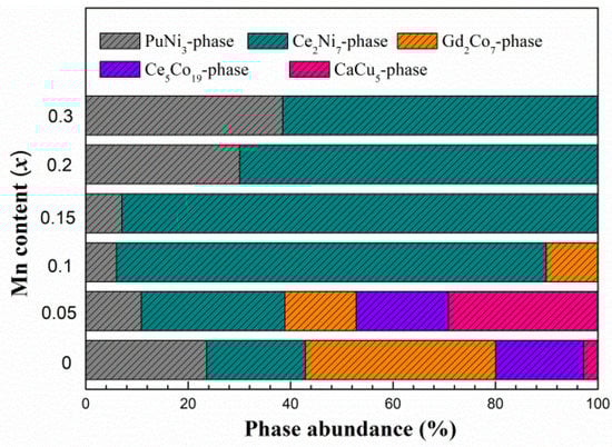 Phase abundance as a function of Mn content of Y0.75La0.25Ni3.5−xMnx (x = 0–0.3) annealed alloys.