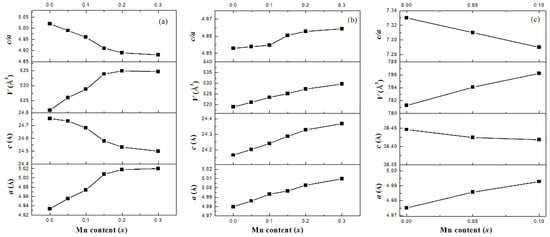 Lattice constant of PuNi3-type (a), Ce2Ni7-type (b), Gd2Co7-type (c)phase as a function of Mn content for Y0.75La0.25Ni3.5−xMnx (x = 0–0.3) annealed alloys.