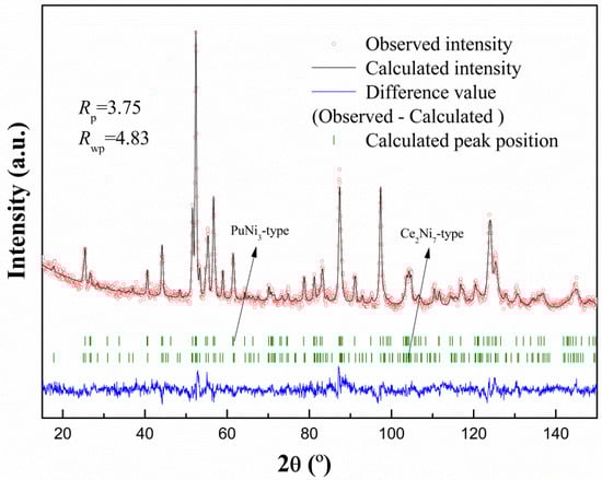 The annealed alloys were crushed mechanically by hand in an agate mortar, and sieved through a 200–300 size mesh for X-ray diffraction (XRD) measurements, 50 size mesh for neutron powder diffraction (NPD) measurements and 200–300 size mesh for alloy electrodes. XRD measurements were performed on a Bruker D8 Advance diffractometer (Bruker Corporation, Karlsruhe, Germany) with Cu radiation and a power of 40 kV × 40 mA. The patterns were recorded over the range from 8° to 120° in 2θ by steps of 0.02°. NPD was analyzed with λ = 1.8846 Å by a step size of 0.02° in the range 12–150° at room temperature. Then, the XRD and NPD collected data were analyzed by the Rietveld method [31] using the Fullprof program (March 2021, Institut Laue-Langevin, Grenoble, France) [32].