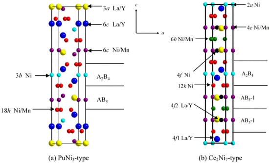 Representative structures of 3R-type PuNi3 (a) and 2H-type Ce2Ni7 (b) stacked by [A2B4] and [AB5] subunits along the c-axis in La-Y-Ni system hydrogen storage alloys with superlattice structure.
