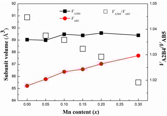The superlattice structure is described as stacking structures made of [A2B4] and [AB5] subunits piled along the c-axis. Their general formula, summarized by Khan [36], can be defined as y = (5n + 4)/(n + 2) (where n is the number of [AB5] subunits). For A2B7 alloy, n is equal to 2 and, consequently, the basic period can be defined as [A2B4] + 2[AB5]. These phases are polymorphs as they crystallize either in hexagonal (2H, Ce2Ni7-type) or rhombohedral (3R, Gd2Co7-type) symmetry. As long as the volume of the [A2B4] subunit is larger than that of the [AB5] subunit, the [A2B4] subunit remains more active with respect to hydrogenation [37]. In other words, for superlattice structure hydrogen storage alloys, the larger the volume mismatch of V[A2B4]/V[AB5] is, the more obvious the “anisotropic” expansion of the lattice will be during hydrogen absorption/desorption. The structural evolution of the hydrogen absorption/desorption of La2Ni7 [17] alloy is the most typical example. Figure 7 shows the variation of the [A2B4] and [AB5] subunits as a function of the Mn content of the Ce2Ni7-type phase. It is clear that the volume of the [AB5] subunit increases almost linearly with increasing Mn content, from 85.22 Å3 (x = 0) to 87.72 Å3 (x = 0.3), while the volume of the [A2B4] subunit is almost unchanged; the results also indicate that Mn mainly occupies Ni sites in the [AB5] subunit, and this is in good agreement with the atomic occupancy (Table 2) obtained from NPD data. In addition, V[A2B4]/V[AB5] decreases gradually, from 1.045 (x = 0) to 1.019 (x = 0.3). This is mainly due to the atomic radius of Mn being larger than that of Ni, and its selective occupation in the superlattice structure. The smaller the volume mismatch in V[A2B4]/V[AB5] is, the better the structural stability of the alloys will be during hydrogen absorption/desorption [38,39].